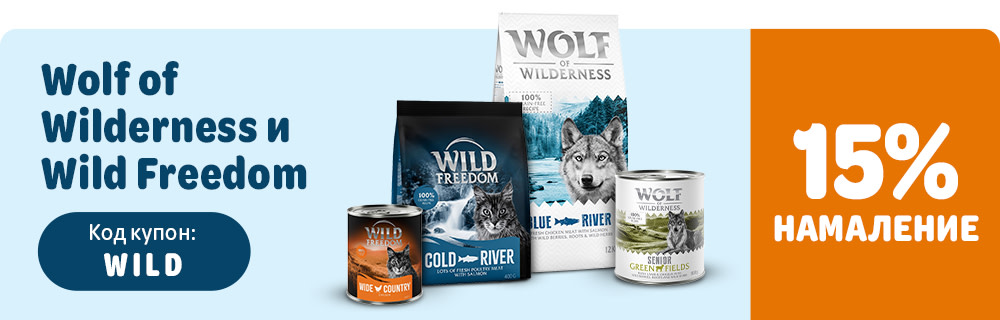 *Код купонът e валиден от 17.02. до 23.02.2026 включително за продукти Wolf of Wilderness и Wild Freedom на стойност ≥ 39€/76.28 лв!